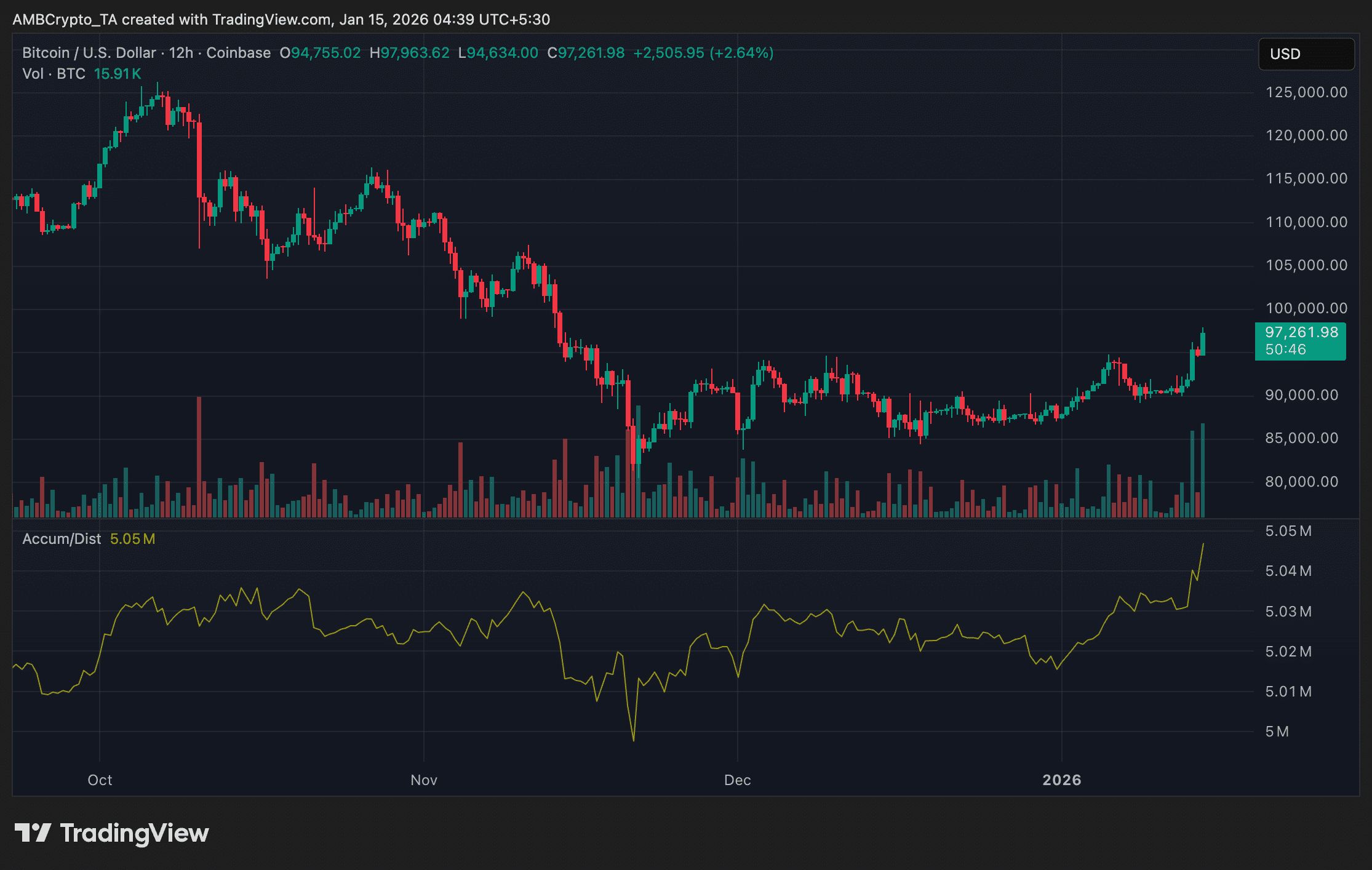 En el momento de escribir esto, Bitcoin cotizaba alrededor de 97.200 dólares, según los datos de TradingView. Esto marca una rotura decisiva por encima del límite superior de un rango de consolidación de varias semanas que había limitado la acción del precio desde finales de 2025.