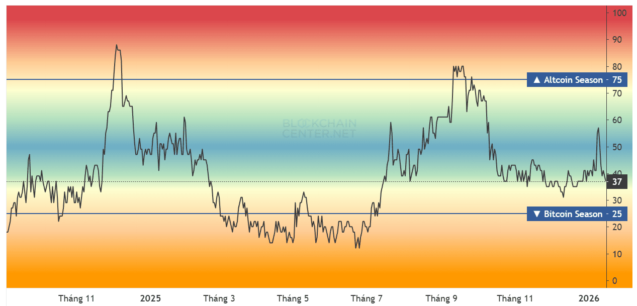 => 37 (actualmente, marca de puntos inferior): No es altseason, estamos en Bitcoin Season (valor del índice = 37 → los altcoins solo superan a BTC en niveles bajos, el dinero sigue fluyendo más hacia BTC).