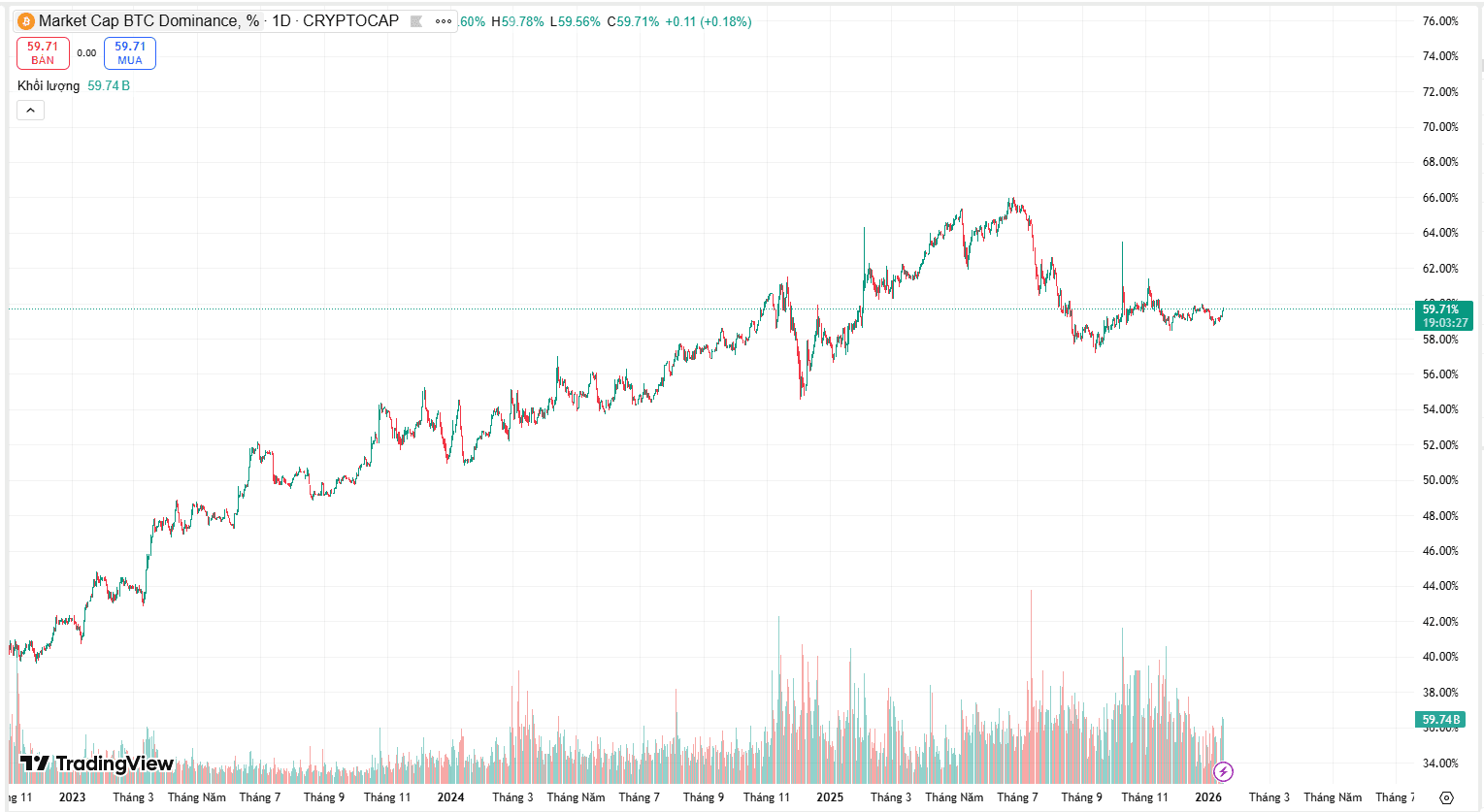 1. Actualmente (enero de 2026): la dominancia de BTC está alrededor del 59.1% (según CoinMarketCap), fluctuando cerca del 58-59% recientemente.