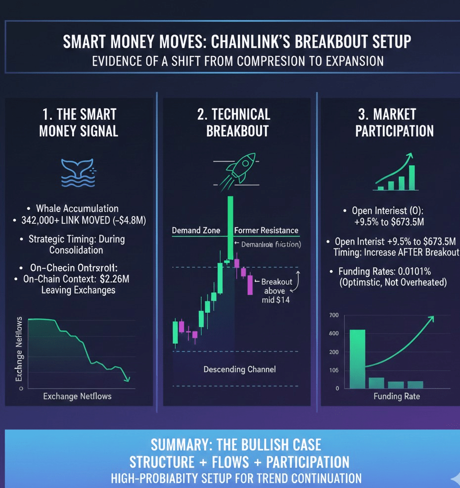 Tomados en conjunto, el rompimiento de Chainlink parece respaldado por señales reales y no por la hype. La acumulación por parte de los grandes, la disminución de la oferta en intercambios, el aumento del interés abierto y los tipos de financiación positivos controlados coinciden todos con un cambio claro en la estructura. El mercado parece estar pasando de un largo período de compresión a una fase de expansión.