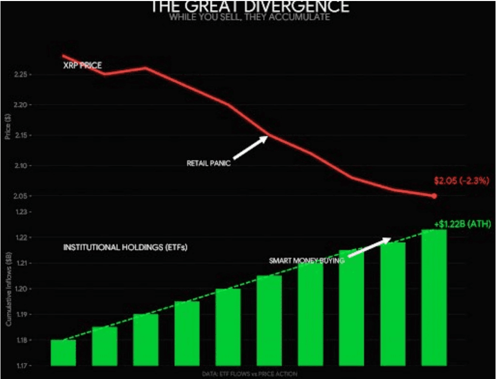 👉 XRP está mostrando una brecha notable entre lo que está sucediendo con el precio y lo que están haciendo las instituciones detrás de escena. Una gráfica reciente revela claramente esta brecha: mientras el precio de la moneda sigue bajando, el dinero institucional sigue entrando. Esto significa que los operadores que solo observan el precio podrían estar pasando por alto la imagen más amplia de quién está realmente acumulando XRP.