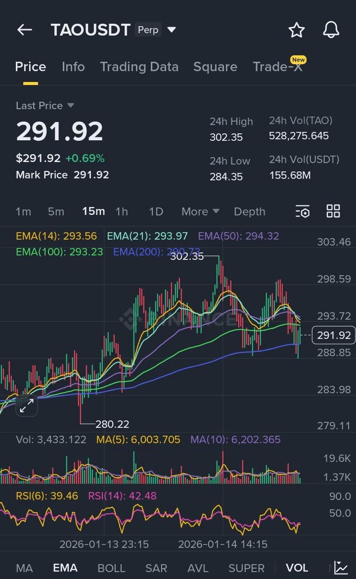 $TAO anteriormente realizó un fuerte movimiento al alza desde la zona de 280 y se acercó a los 302 📈. Tras ese impulso, el precio no logró mantener los máximos y comenzó a moverse lateralmente con una corrección lenta. Actualmente, se está negociando alrededor de los 291-292, que es una zona importante de soporte dentro de este rango 🟢.
