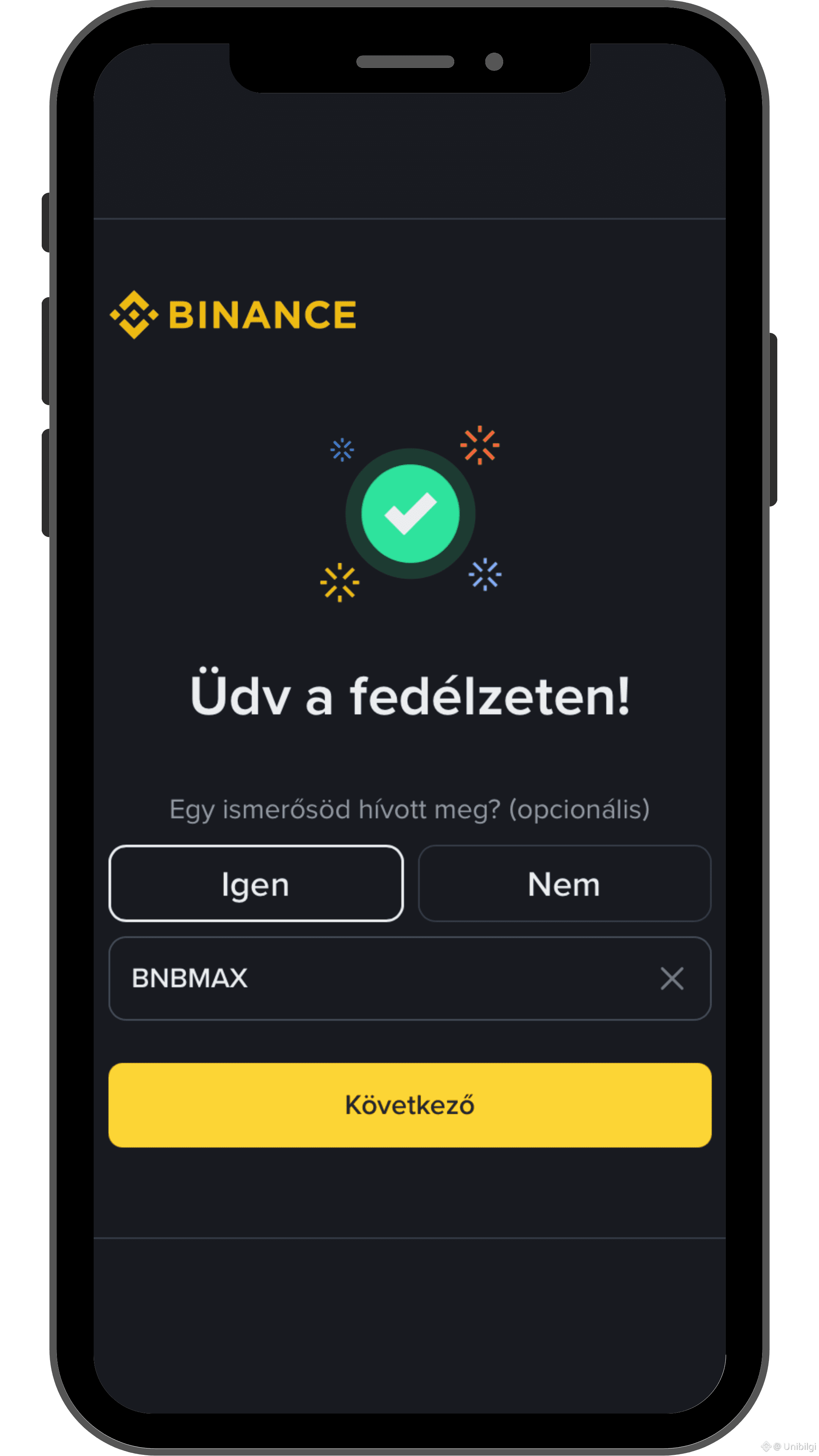 A regisztráció során egyszerűen írd be a BNBMAX kódot az Ajánlói azonosító mezőbe. Az e-mail vagy telefonszám megerősítése és a személyazonosítás után a Jutalomközpont automatikusan elérhetővé válik. A jutalmak a megfelelő lépések – például az első ügylet – teljesítése után maguktól megjelennek. Nincs szükség külön aktiválásra.