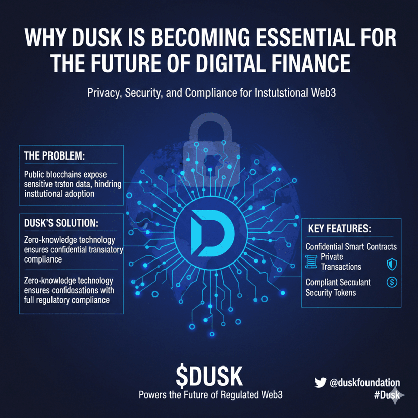 El token Dusk impulsa contratos inteligentes confidenciales, transacciones privadas y nuevos instrumentos financieros como tokens de seguridad compatibles. A medida que el mundo se mueve gradualmente hacia una infraestructura Web3 regulada, el papel de Dusk se vuelve aún más importante. El proyecto está construyendo tecnología que las empresas e instituciones reales pueden utilizar, no solo hype.#Dusk $DUSK @Dusk