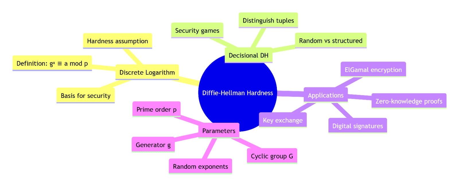 Most of the cryptographic building blocks related to this work are linked to the Diffie-Hellman assumption which uses the hardness of discrete logarithms in cyclic groups .