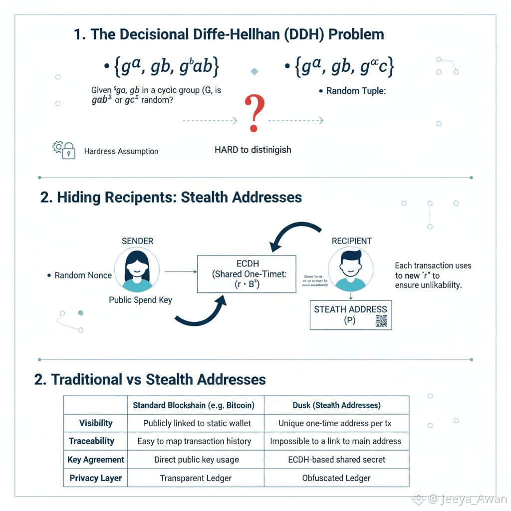 Inspired by the CryptoNote white-paper, stealth address technology is at the basis of #Dusk recipient hiding technique. Already widely tested in other privacy-oriented digital currencies, it is the proven choice for concealing the true recipient address of a transaction while keeping uniqueness within the context of the ledger (meaning no other address can be linked to a stealth address). Additionally, a derivation of an unbound number of receiving addresses is also possible without any of them allowing traceability back to the recipient’s main address. As an anonymous key agreement protocol, Dusk uses the Elliptic Curve Diffie-Hellman (ECDH) due to the desired property of allowing two parties to generate a shared secret by solely knowing each other’s public key, and the generator point of the Elliptic Curve used in the Twisted Edward equation.