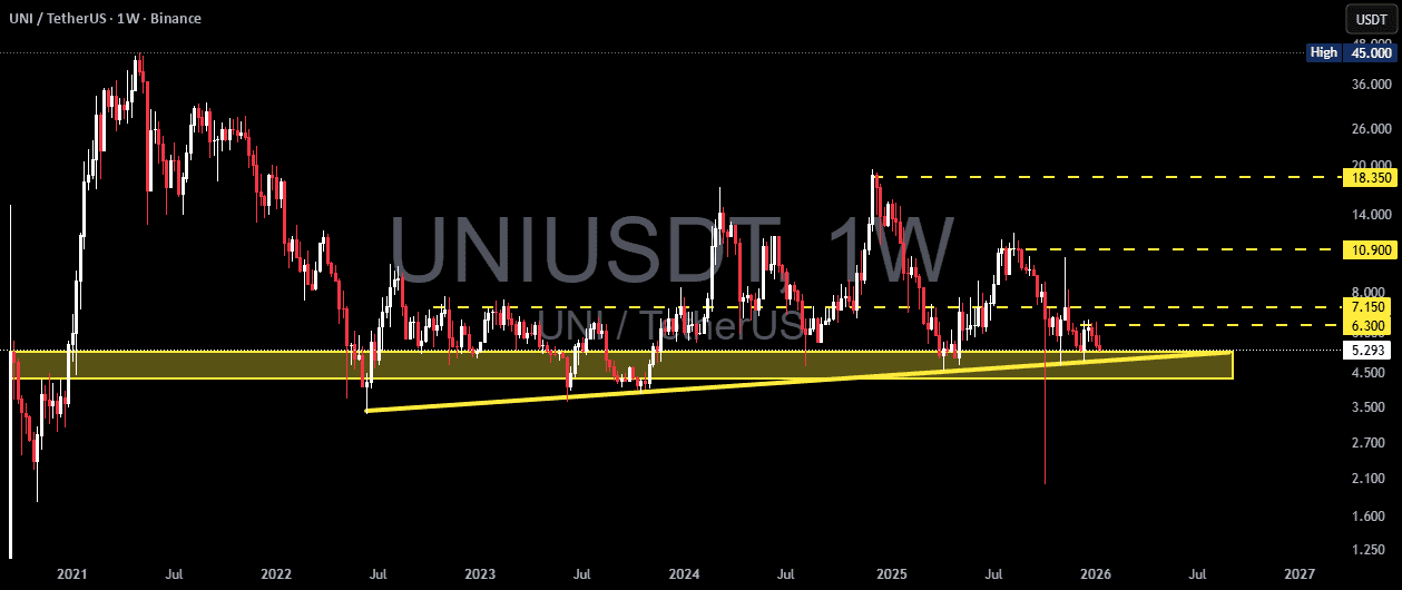UNI/USDT se está negociando actualmente en el marco de tiempo semanal (1W) y permanece dentro de un rango amplio después de una tendencia bajista prolongada desde su máximo histórico. Los precios han vuelto a probar la zona de demanda principal (caja amarilla 5.2 – 4.3), que ha funcionado como un fuerte soporte histórico desde 2022.