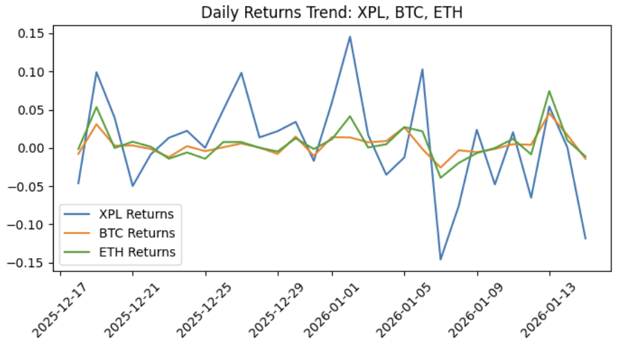 El gráfico de tendencias de precios muestra la evolución de los precios de cierre de tres activos durante el período de estudio. Los precios de BTC y ETH están muy por encima de XPL, por lo que la curva de XPL en el gráfico está cerca del eje x. El gráfico de tendencias de rendimiento indica que la variación diaria de XPL es más volátil que la de BTC y ETH, pero la dirección general es bastante consistente, especialmente cerca de finales de año y durante el período de Año Nuevo.