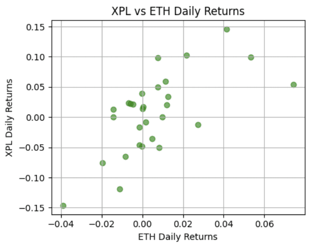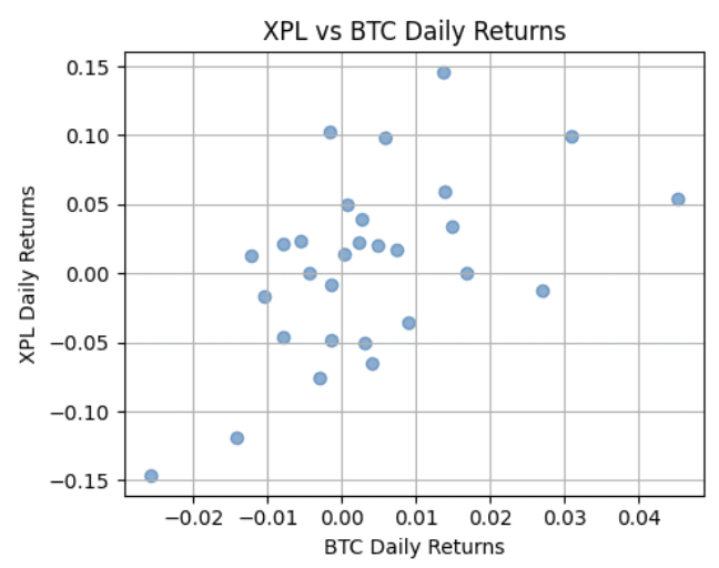Luego, se calcula la correlación lineal entre los rendimientos diarios de XPL y los rendimientos diarios de BTC y ETH utilizando el coeficiente de correlación de Pearson, obteniendo el gráfico de dispersión con BTC y ETH.