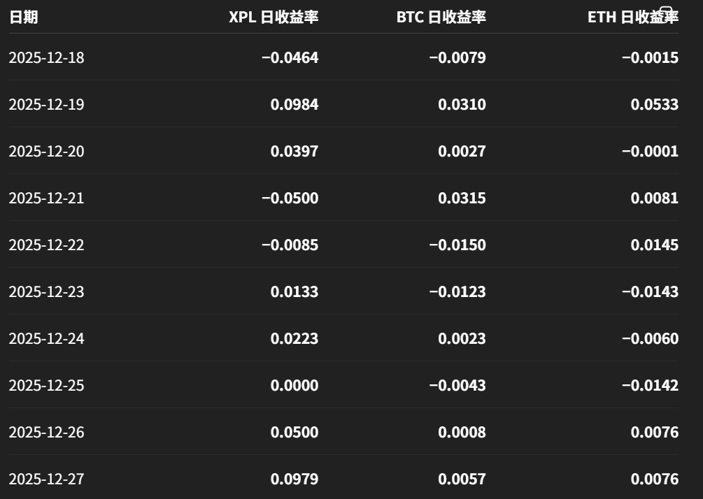 Para analizar la correlación entre el token XPL del proyecto Plasma en la plataforma Binance y BTC y ETH, he recopilado y resumido los precios históricos de BTC, ETH y XPL desde su lanzamiento, así como la tasa de aumento diaria. Los datos son como se muestra en la figura a continuación.