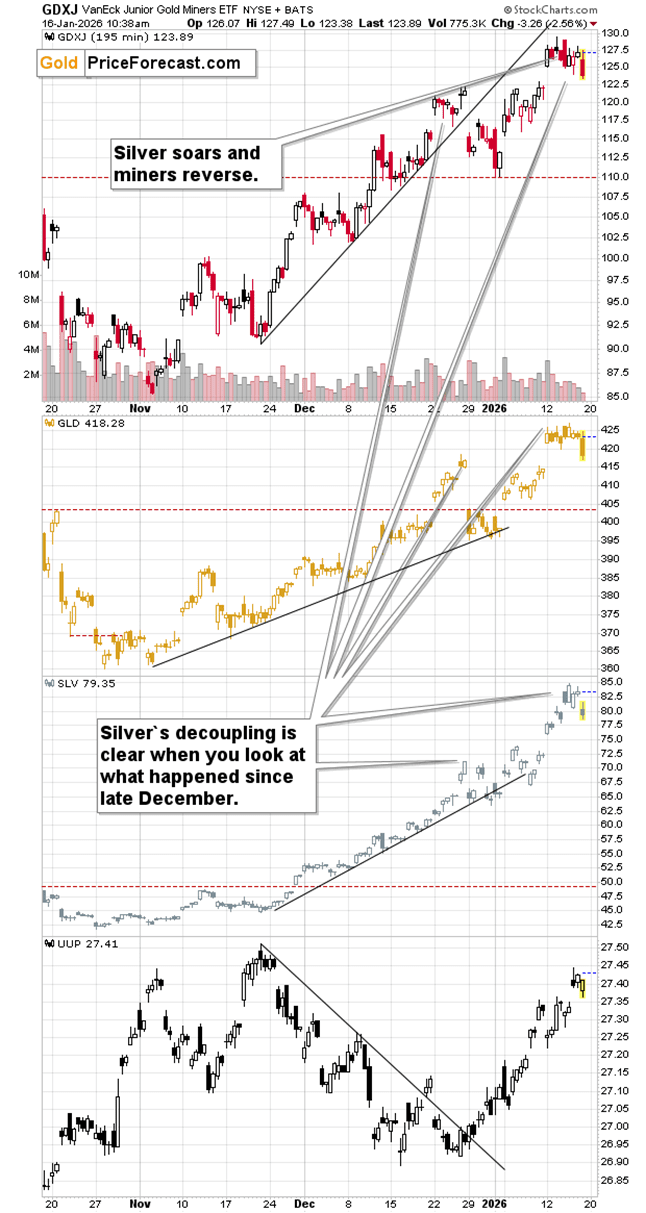 Se espera que esta inminente debilidad del mercado de acciones se extienda a los metales preciosos. El oro ya ha invalidado su ruptura por encima de $4,600, apuntando a un movimiento hacia $4,500. Mientras que la plata puede mostrar algo de resiliencia, se considera que las acciones mineras son particularmente vulnerables a una fuerte caída. El fortalecimiento del dólar estadounidense agrega más presión a la baja en estos activos. En resumen, el tropiezo de NVDA es una campana de advertencia tanto para las acciones como para los metales preciosos.