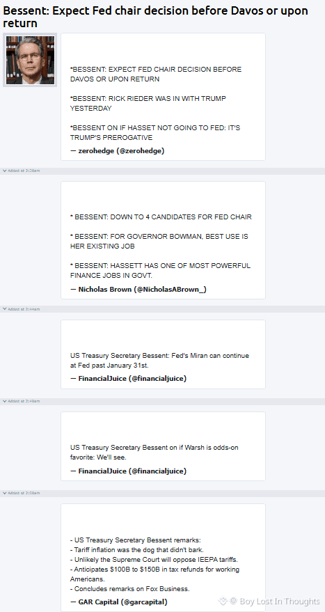 U.S. Treasury Secretary Bessent indicated a decision on the next Federal Reserve Chair will be announced either before or after the Davos meetings. Four candidates remain in contention, with notable figures like Rick Rieder and Kevin Hassett being discussed. Bessent also commented that current Governor Michelle Bowman is best suited to stay in her role, noted that tariff-related inflation has been minimal, and predicted substantial tax refunds for working Americans.
