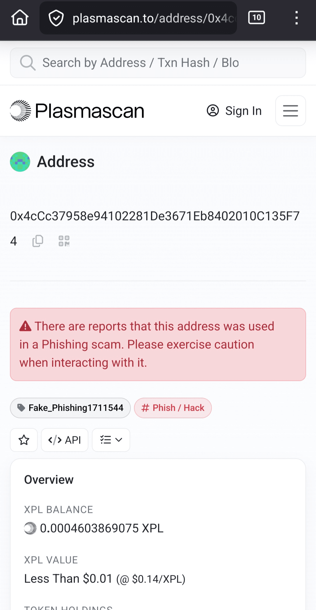 2. Este token falso solo apareció en mi billetera después de que hice clic en "Agregar Token" – Binance había bloqueado esta moneda falsa porque la dirección del remitente fue marcada como phishing y fraudulenta. Por supuesto, con mi fuerte conocimiento y comprensión de lo que estaba haciendo, lo agregué para probar este tipo de phishing! No recomiendo experimentar en absoluto – ¡estás a solo un clic de ser estafado!