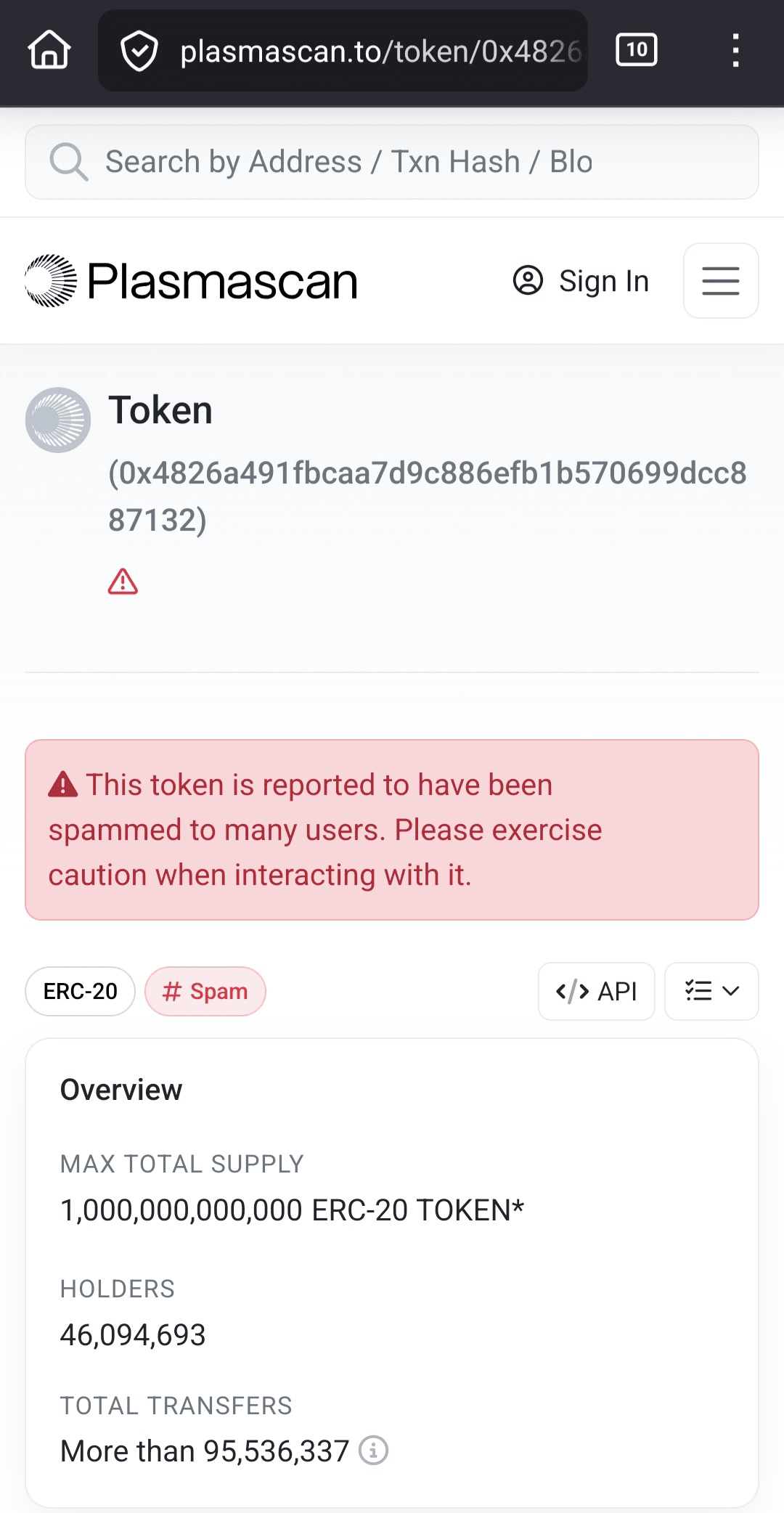 1. Operación de Spam Masiva: Un contrato de token fue reportado como spam con más de 46 millones de titulares y 95 millones de transferencias - evidencia clara de una campaña de spam generalizada.