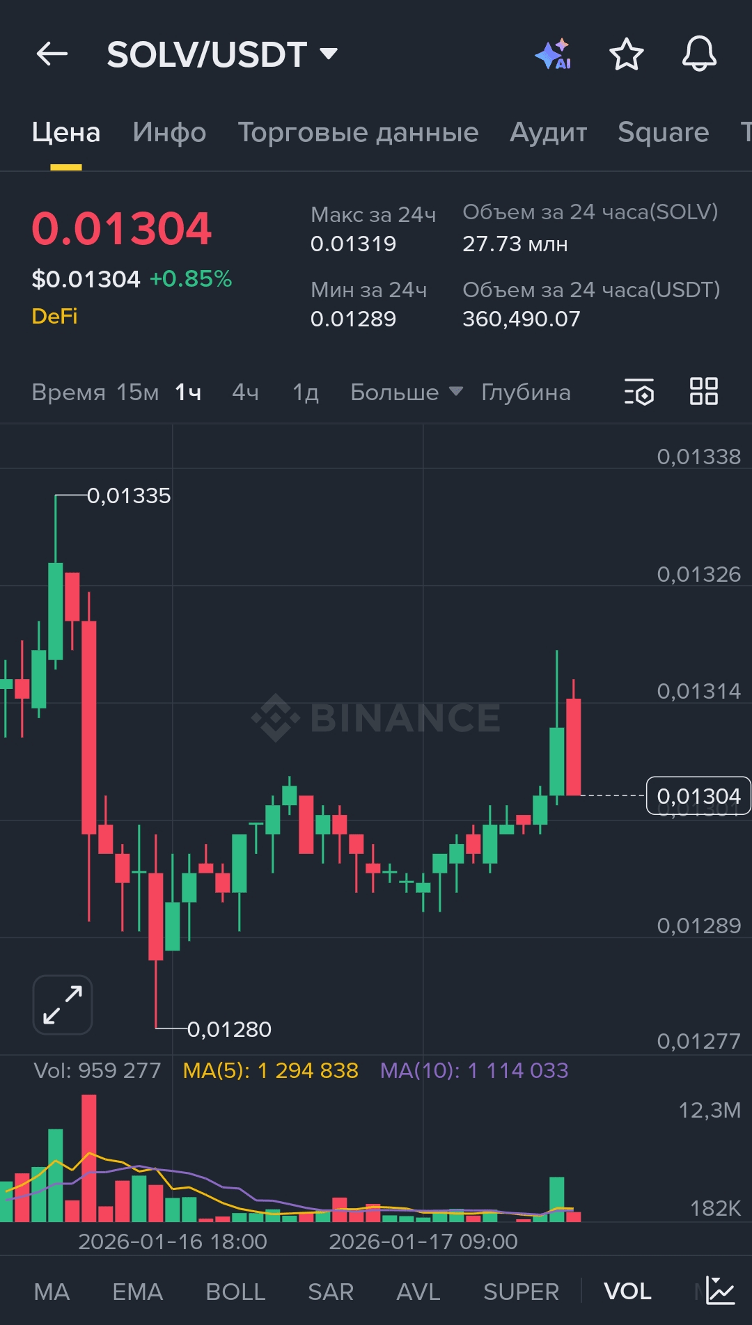 $SOLV se negocia aproximadamente ≈ 0.0131💲 (datos del mercado en tiempo real)