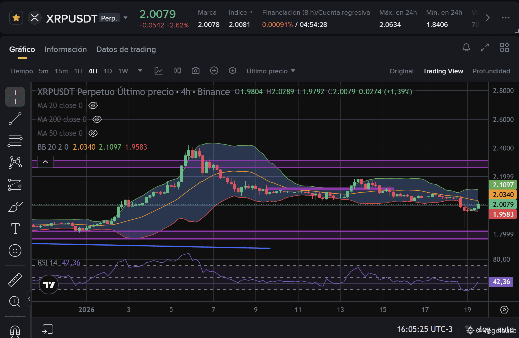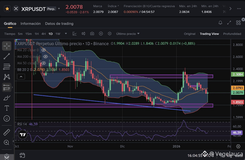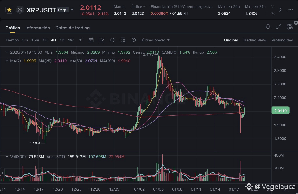 XRP inicia esta semana del 19 de enero de 2026 con el corazón en la boca. Tras un "susto" técnico que llevó el precio a barrer violentamente la zona de los 1.84 USDT durante el fin de semana, el activo ha logrado recuperar el nivel psicológico de los 2.00 USDT. En un mercado inundado de titulares sobre ETFs y licencias europeas, la acción del precio cuenta una historia de liquidaciones y defensa territorial.