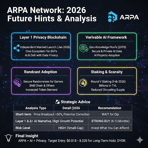 Para los inversores a largo plazo, la perspectiva es fundamentalmente más fuerte. El lanzamiento exitoso de su blockchain de privacidad Layer 1 independiente y su integración como infraestructura de IA Verificable central transforma a ARPA de un simple token utilitario en un jugador tecnológico fundamental. Esto establece un fuerte caso para considerarlo una "Fuerte Compra" para un horizonte de inversión de 6 a 12 meses.