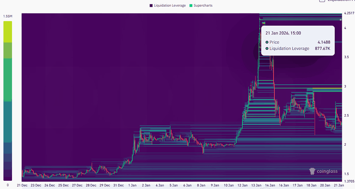 Los datos muestran que cerca de 4 dólares, hay un grupo de liquidez de aproximadamente 290,000 dólares. Esto significa que una vez que el precio se acerque a esta área, la participación del mercado y la intensidad del juego aumentarán significativamente.