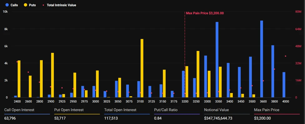 Los opciones de Ethereum representan los restantes $347,7 millones en nominal. ETH se cotiza alrededor de $2 958, notablemente por debajo del nivel de dolor máximo de $3 200.