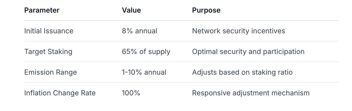 Parámetro Económico Valor Objetivo Mecanismo de Ajuste Tasa de Staking Objetivo 65% del suministro Equilibra seguridad y participación Tasa de Inflación Anual 1-10% Ajustada dinámicamente según la tasa de staking Tasa de Ajuste de Inflación 100% Mecanismo de respuesta rápida Impuesto Comunitario 3% de las tarifas del protocolo Asignado a quema de tokens y desarrollo del ecosistema