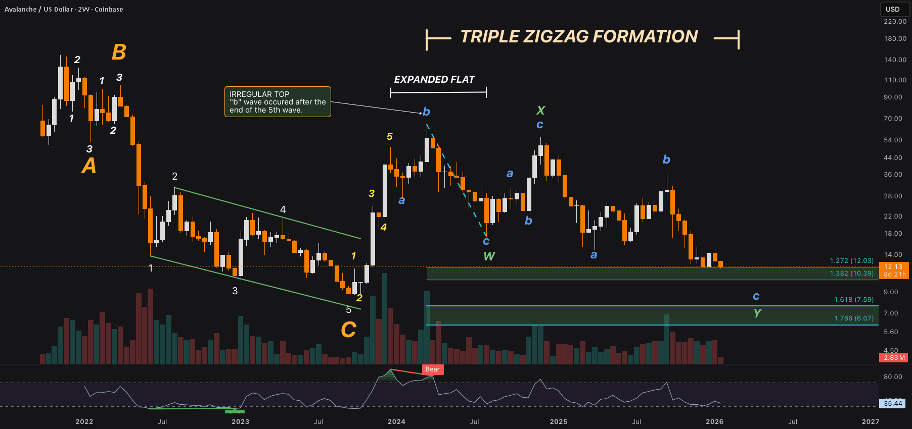 Parece que AVAX ha estado formando una corrección de triple zig-zag en un marco de tiempo alto. Después de un estudio más detallado de marcos de tiempo más bajos, he descubierto fractales más pequeños de esta corrección de grados inferiores. La acción del precio está actualmente soportada por el bolsillo 1.272, que PODRÍA conducir a una reversión, pero el 1.618 (Ola "W" × 0.618) es una proporción preferida por encima del 1.272. Sin embargo, hay migajas en un marco de tiempo más bajo que sugieren que podríamos estar experimentando otro fractal de esta estructura.