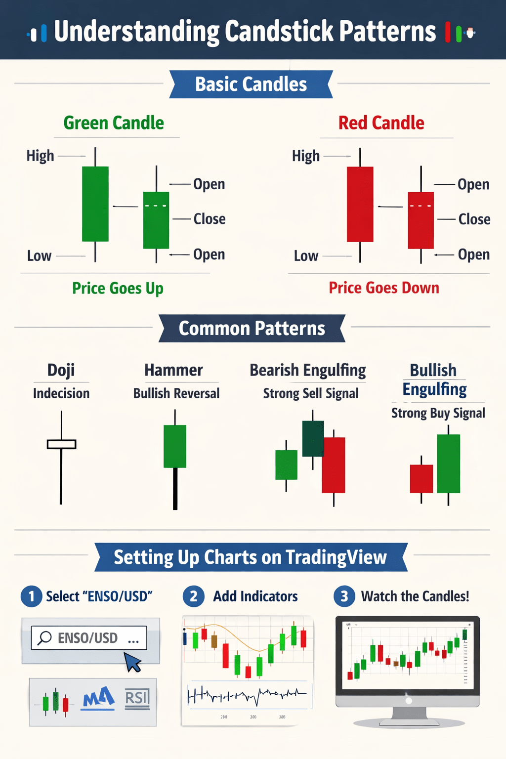 Los gráficos de velas son la forma más común de ver la acción del precio en cripto. Aquí tienes una imagen simple que puedes usar...