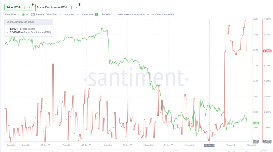La recuperación de métricas fundamentales se reflejó en el espacio informativo. La proporción de menciones de Ethereum en las redes sociales aumentó drásticamente. El indicador subió del 0,37% al 4,43% en comparación con el día anterior. En un momento, el valor alcanzó el 5,8%.