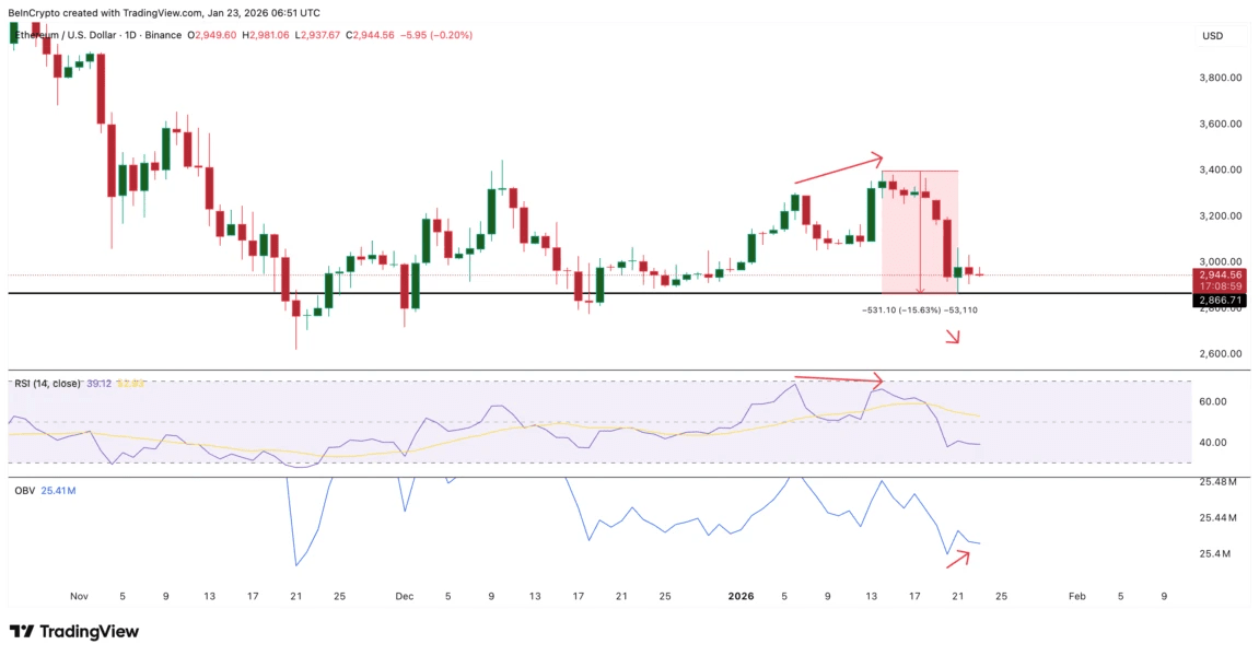 El debilitamiento de las posiciones de Ethereum no fue repentino. Durante el período del 6 al 14 de enero, se formó una 'divergencia bajista' en el gráfico diario del RSI. El índice de fuerza relativa mostró un máximo más bajo en medio del aumento del precio del activo. Este tipo de panorama técnico a menudo señala el agotamiento de la tendencia.