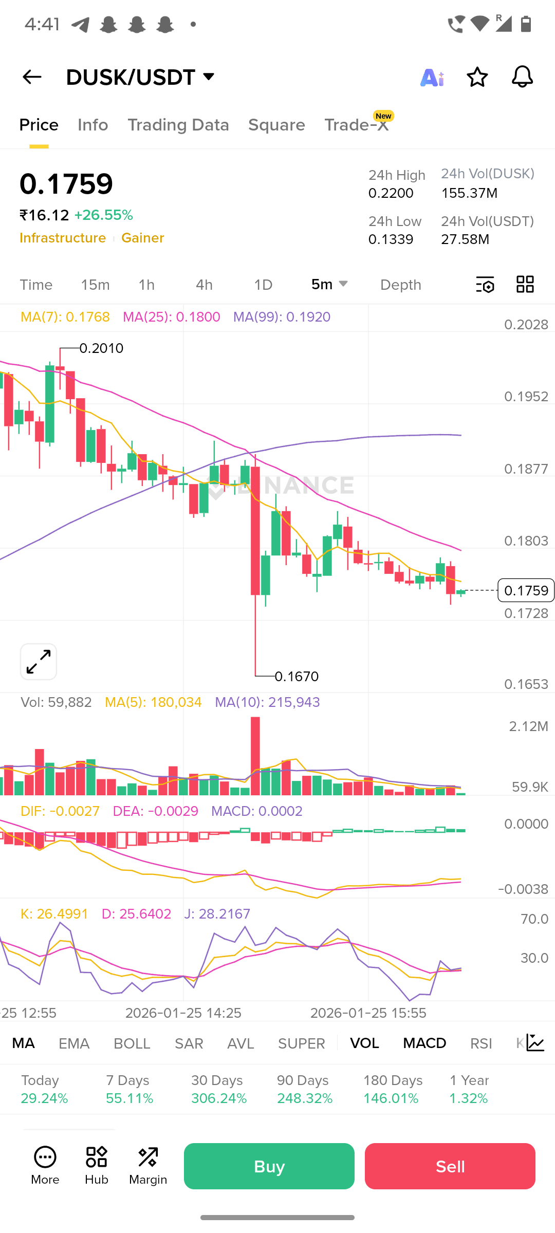 Rendimiento: DUSK ha mostrado alta volatilidad con un reciente aumento diario de más del 15%, pero también experimentó una caída del -13.6% en las 24 horas previas al 25 de enero de 2026.