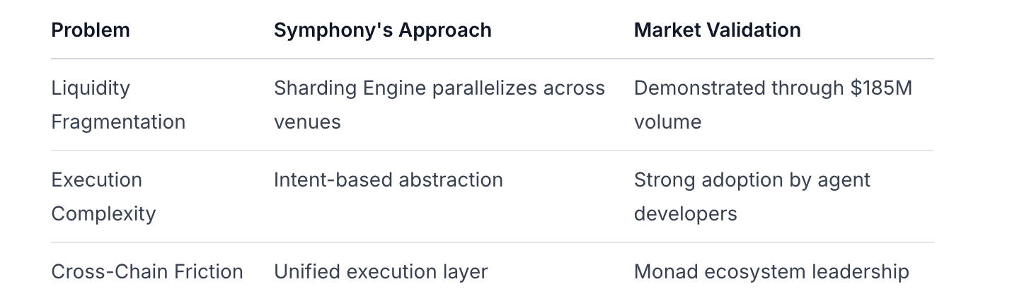 Symphony demuestra una innovación arquitectónica excepcional en la ejecución DeFi nativa de IA y una fuerte validación temprana del mercado a través de su liderazgo en el ecosistema Monad. El protocolo aborda problemas estructurales genuinos en la fragmentación de liquidez DeFi y la complejidad de la experiencia del usuario.