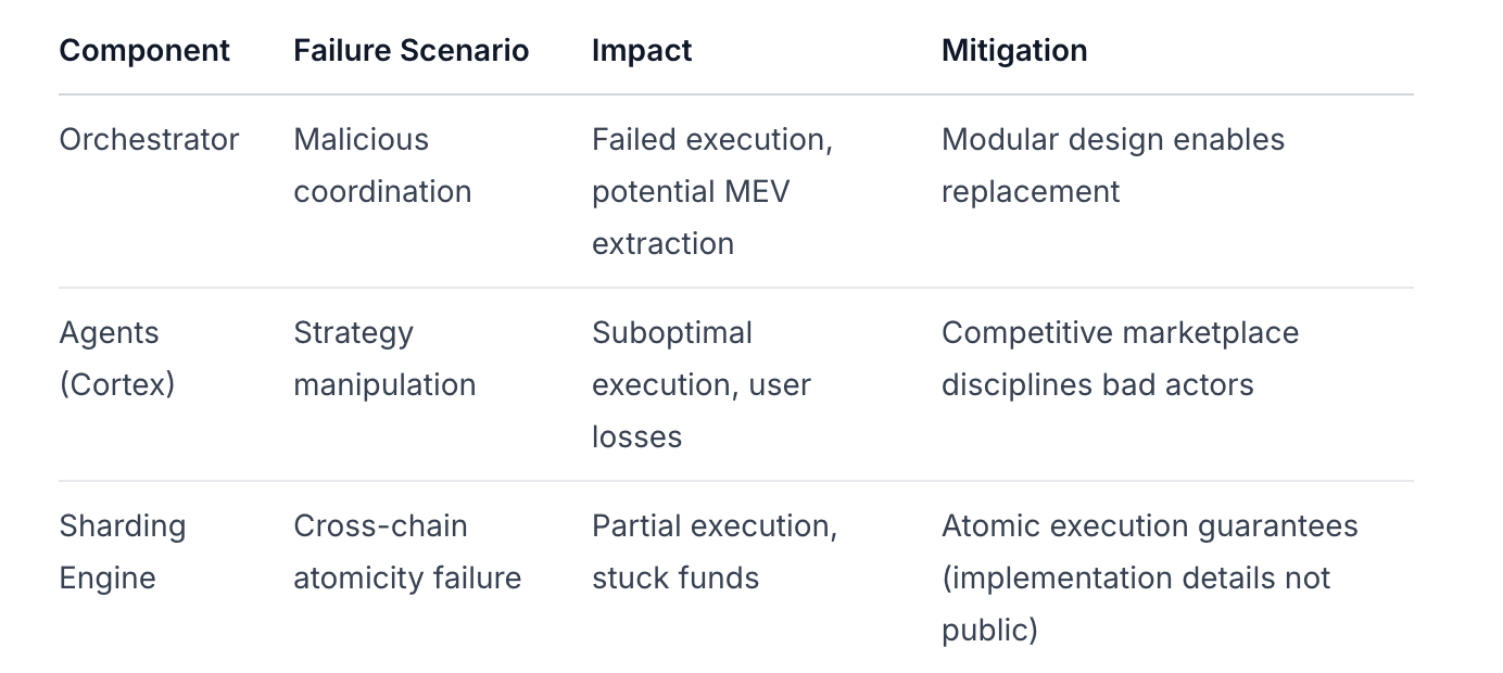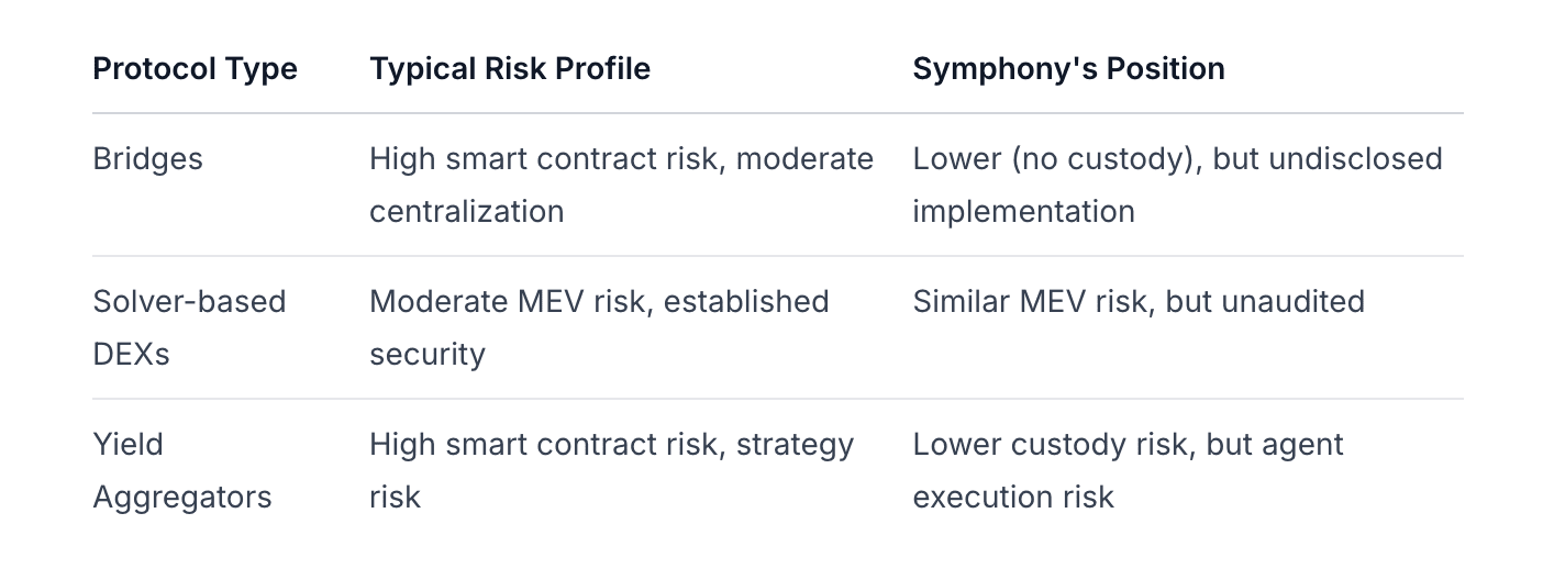 Evaluación: Symphony reduce la confianza en comparación con soluciones de custodia pero introduce nuevas dependencias en la integridad de la red de agentes y mecanismos de coordinación entre cadenas.