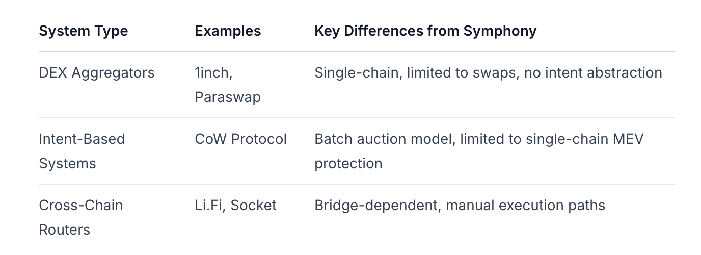 Symphony se diferencia a través de su composibilidad de agentes de IA, gestión del estado omnicanal (Maestro) y ejecución de fragmentación paralela en lugar de subastas por lotes tradicionales o enrutamiento basado en puentes.