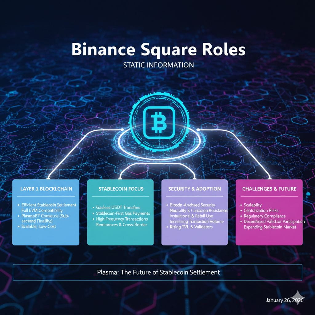 Plasma is a Layer 1 blockchain designed for efficient stablecoin settlement, combining full EVM compatibility with PlasmaBFT, a consensus mechanism offering sub-second finality. Its architecture is built to address the growing demand for scalable, low-cost solutions in stablecoin transactions, focusing on features like gasless USDT transfers and stablecoin-first gas payments. Plasma’s integration with Bitcoin-anchored security enhances its neutrality and censorship resistance, providing a robust foundation for institutional and retail use cases in payments and finance. Its ability to offer near-instant finality, coupled with low transaction fees, positions Plasma as an attractive solution for high-frequency stablecoin transactions, including remittances and cross-border payments. On-chain metrics like increasing transaction volumes, rising TVL, and growing validator participation suggest strong adoption and liquidity, though challenges remain regarding scalability and centralization risks. @Plasma reliance on stablecoins for transaction fees further strengthens its position in the expanding stablecoin market. However, scalability, regulatory compliance, and ensuring decentralized validator participation will be critical to Plasma’s long-term success in the crypto ecosystem.