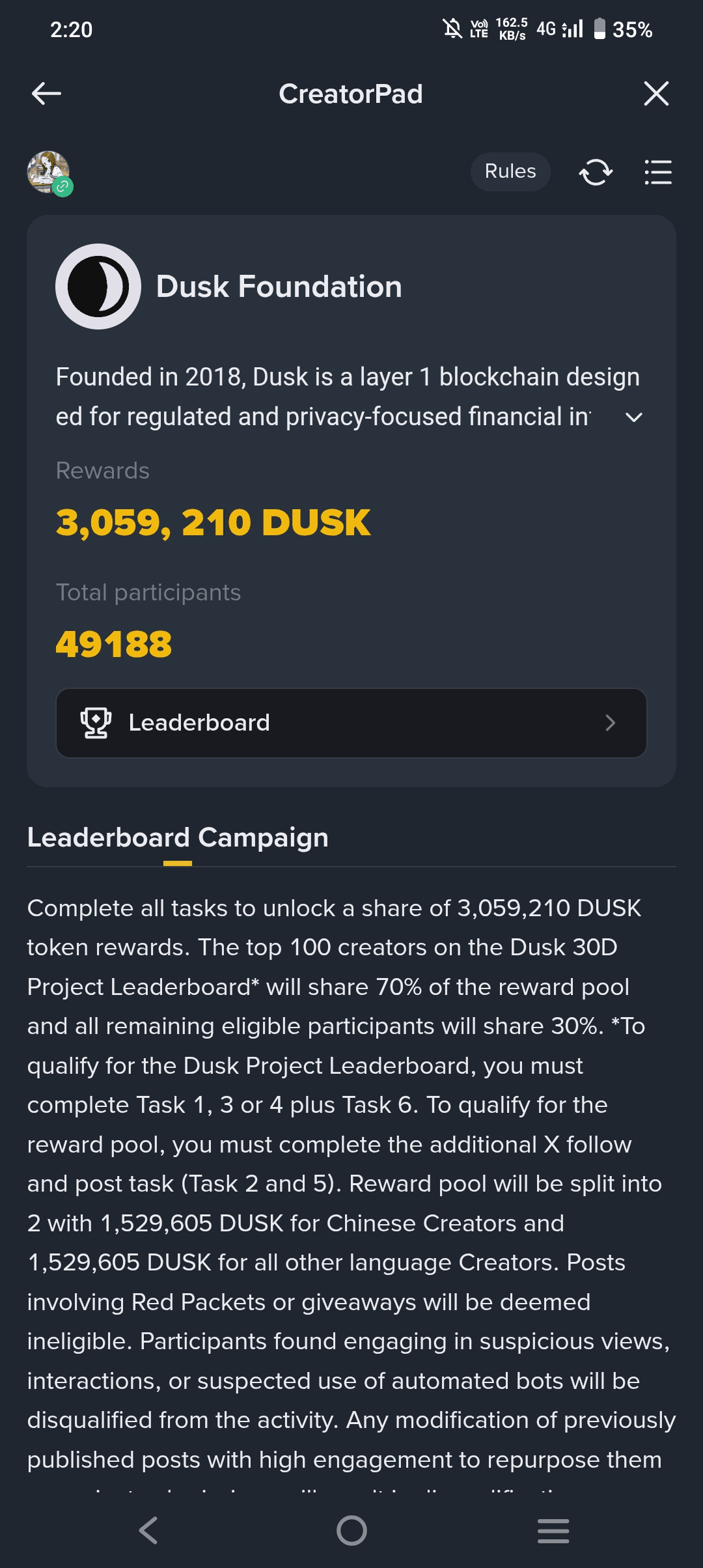 Completa todas las tareas para desbloquear una parte de 3,059,210 recompensas en tokens DUSK. Los 100 principales creadores en el Ranking del Proyecto Dusk 30D* compartirán el 70% del fondo de recompensas y todos los demás participantes elegibles compartirán el 30%. *Para calificar para el Ranking del Proyecto Dusk, debes completar la Tarea 1, 3 o 4 más la Tarea 6. Para calificar para el fondo de recompensas, debes completar la tarea adicional de seguir y publicar (Tarea 2 y 5). El fondo de recompensas se dividirá en 2 con 1,529,605 DUSK para Creadores Chinos y 1,529,605 DUSK para todos los demás Creadores de otros idiomas. Las publicaciones que involucren Paquetes Rojos o sorteos serán consideradas no elegibles. Los participantes que se encuentren involucrados en vistas sospechosas, interacciones o el uso sospechado de bots automatizados serán descalificados de la actividad. Cualquier modificación de publicaciones previamente publicadas con alta participación para reutilizarlas como presentaciones de proyectos resultará en descalificación. Las recompensas se distribuirán antes del 2026-02-28 en el Centro de Recompensas.