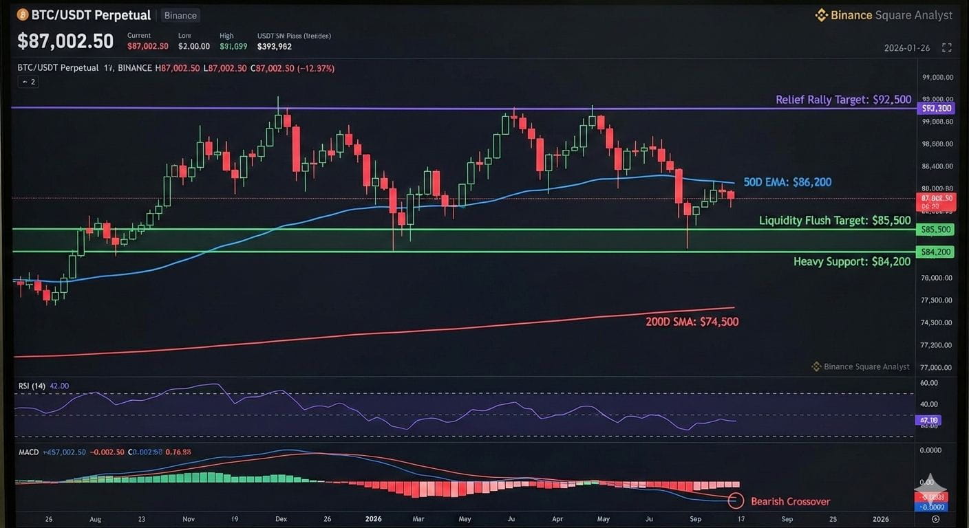 Promedios Móviles: Bitcoin actualmente está flotando justo por encima de su EMA de 50 días ($86,200). Históricamente, un cierre diario por debajo de este nivel ha llevado a una nueva prueba del SMA de 200 días, que actualmente se encuentra muy abajo en $74,500.