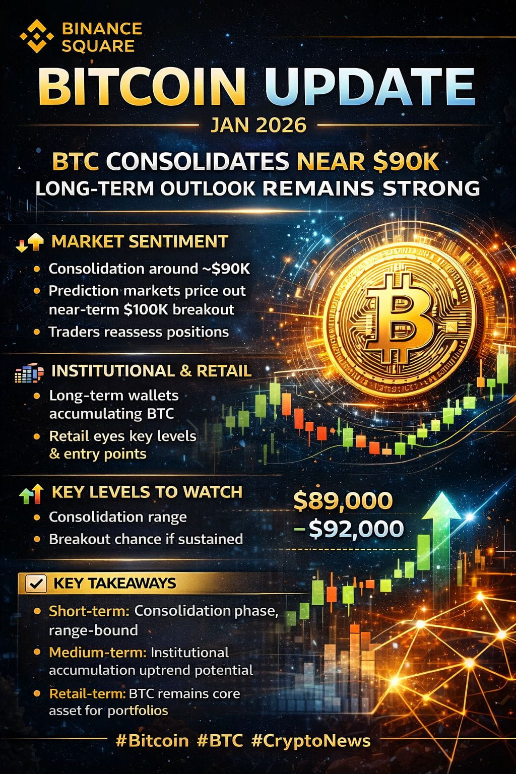 $BTC se consolida cerca de $90K después de la reciente volatilidad. La perspectiva a largo plazo sigue siendo fuerte a medida que los inversores institucionales continúan acumulando, señalando un potencial para la próxima fase alcista. 📊💰