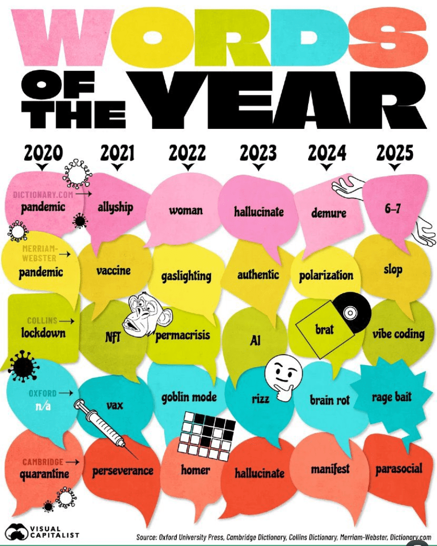 Resumen de las palabras de moda anuales de los últimos 6 años (2020-2025):