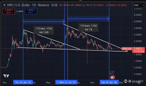 Mira, familia, el mercado tiene memoria y un analista apodado "Bird" acaba de soltar una bomba técnica que no podemos ignorar. Resulta que XRP tiene un patrón casi idéntico al que vimos en su gran expansión de 2025. En aquel entonces, le tomó exactamente 173 días romper su máximo histórico después de meterse en una figura que los expertos llaman "cuña descendente". ¿Y adivina qué? Desde el pico que vimos en julio de 2025 hasta hoy, han pasado... ¡exactamente los mismos 173 días! 📉➡️📈