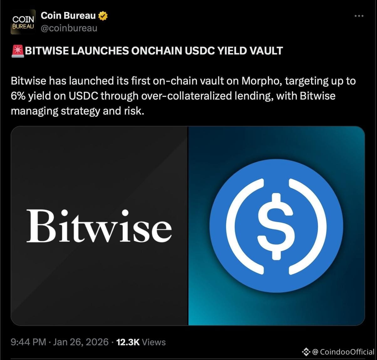 • Bitwise has launched its first on-chain USDC yield vault.
