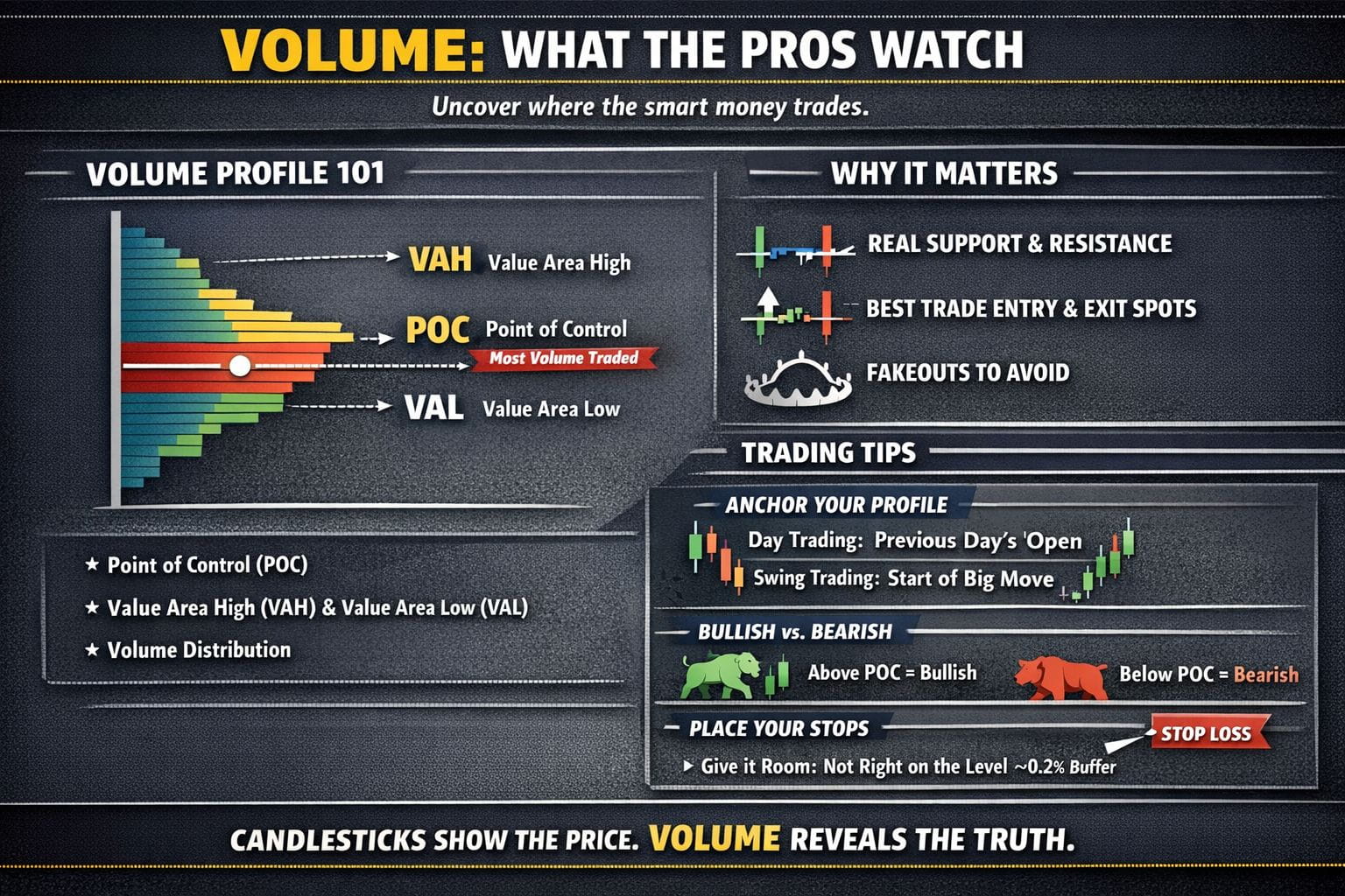 Volume Profile: It’s a visual map of volume at every price level. Unlike candles, this thing doesn’t lie.