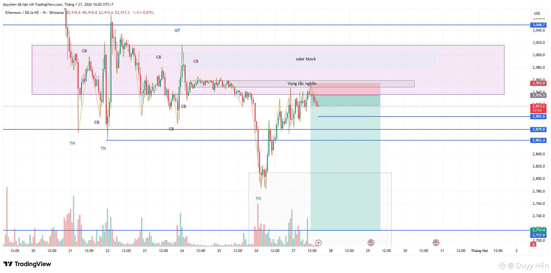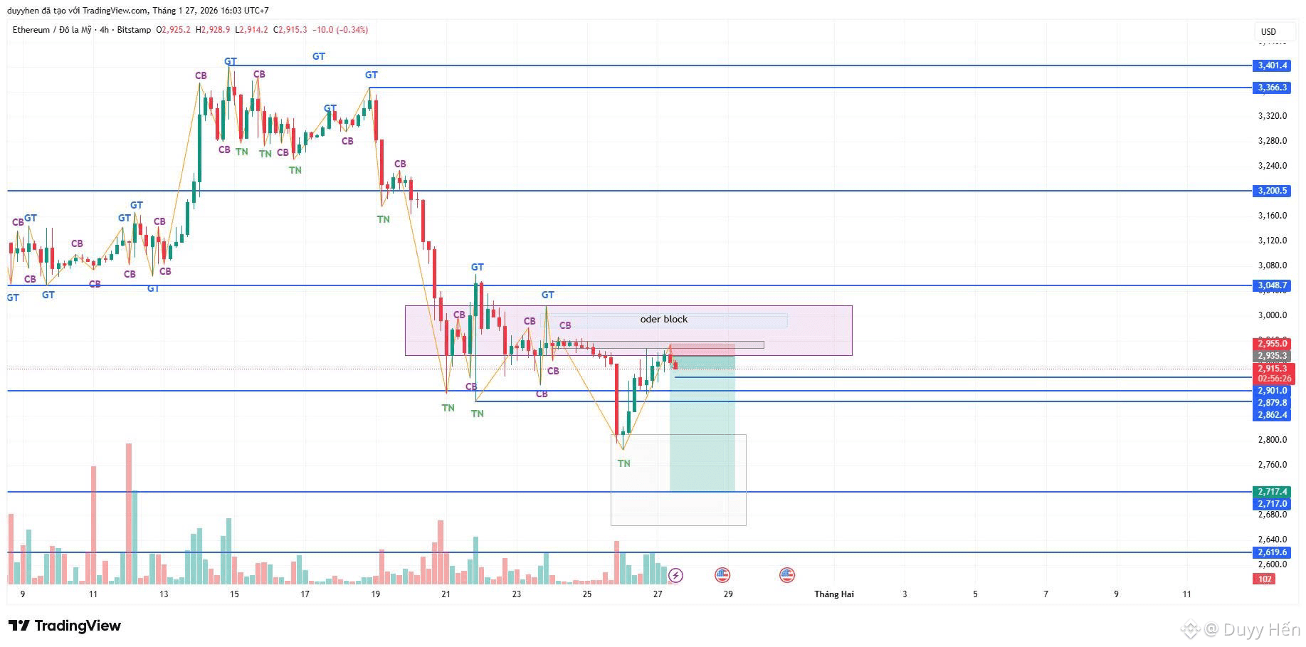 Vùng quan sát: Hiện tại giá đang phản ứng tại cụm Order Block quanh mốc 2,900$ - 2,950$. Đây là vùng tranh chấp quan trọng.