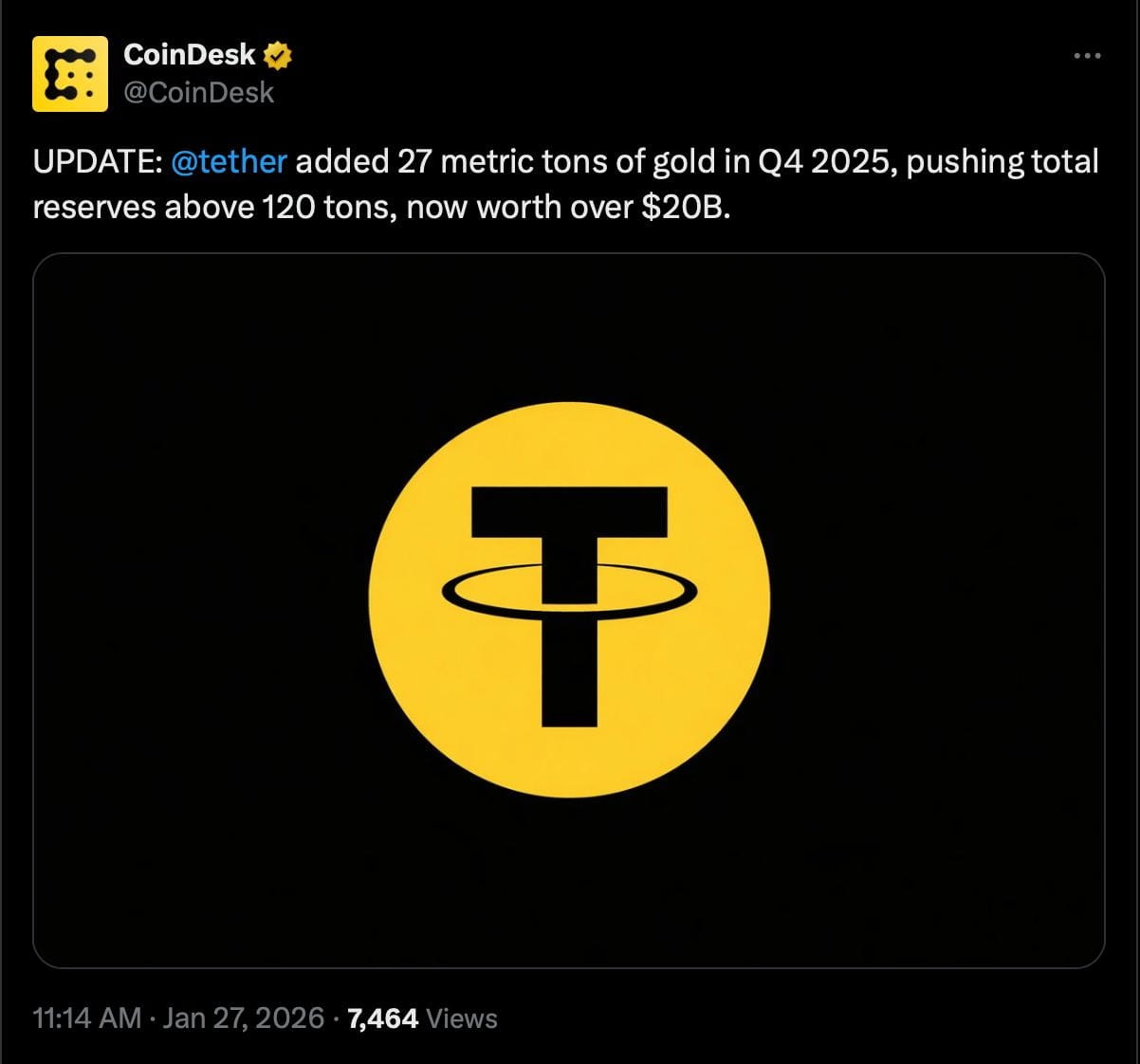 Tether añadió 27 toneladas métricas de oro en el Q4 2025.