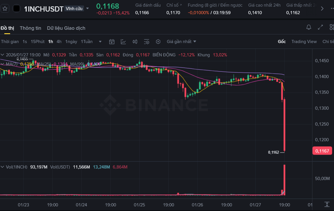 Esta venta masiva ha barrido la liquidez de la Buy wall, causando que el precio $1INCH cayera drásticamente un -7% en un instante, de $0.1385 a $0.129.