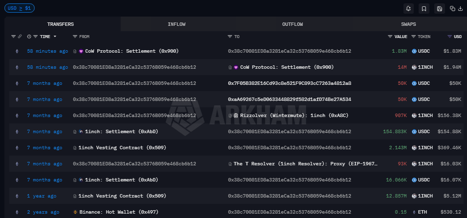 Esta billetera ha recibido 15 millones de 1INCH a través de un pago de vesting de hace un año.