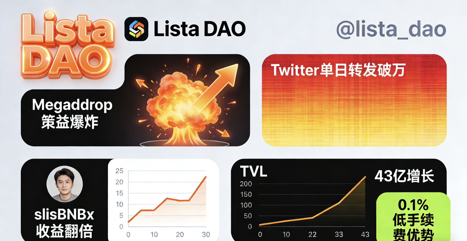 快看BNB Chain的热搜榜,Lista DAO的官方Twitter@ListaDAO 正以粉丝暴增的速度霸屏!从上线至今,账号互动数据呈指数级飙升,转发峰值单条超5000,评论区充斥着用户对slisBNB流动性质押的狂热赞叹。这不是巧合,而是Lista DAO作为BNBFi领军者的铁证——它已成为链上USD1生态的最大枢纽,TVL一度突破43亿美元,借贷效率傲视群雄。为什么@lista_dao的每条推文都能引发热议?因为它直击痛点:通过低成本lisUSD借贷,用户轻松释放BNB流动性,避免了传统DeFi的繁琐步骤,转而拥抱secure且permissionless的体验。