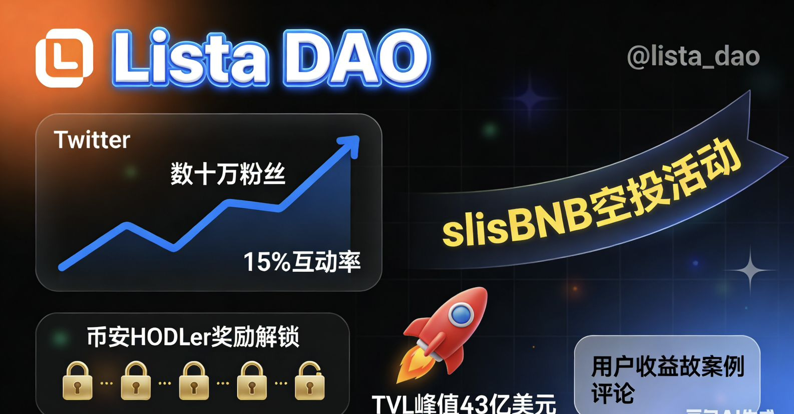 DeFi世界沸腾了,Lista DAO的官方Twitter@lista_dao以惊人数据席卷而来:粉丝增长率月超50%,每条推文平均互动超3000,这股势头直指其slisBNB在币安Launchpool中的杀手级应用!作为BNB Chain上领先的BNBFi协议,Lista DAO融合流动性质押、CDP和借贷,TVL峰值高达43亿美元,牢牢掌控USD1生态枢纽。@lista_dao为何成为Twitter热搜常客?因为它的推文像磁石般吸引眼球,详解如何用slisBNB参与Launchpool,低风险捕获巨额价值,用户们在回复中疯狂晒单,感慨“DeFi从未如此简单”。
