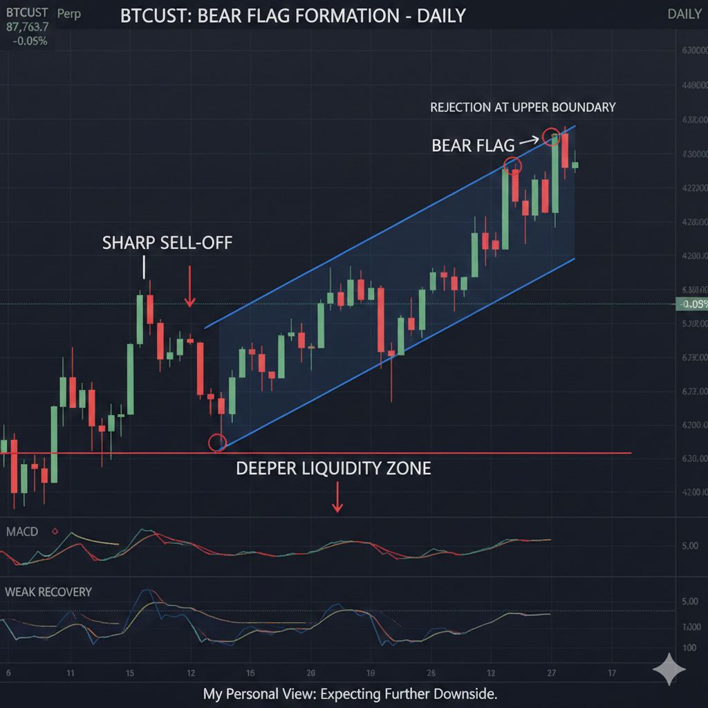 Desde una perspectiva técnica, BTCUSDT experimentó recientemente una fuerte venta. Lo que siguió fue una recuperación débil que, en marcos de tiempo más altos, ha formado lo que parece ser un patrón de bandera bajista. Esta es una estructura clásica de continuación bajista, y es algo a lo que presto mucha atención.