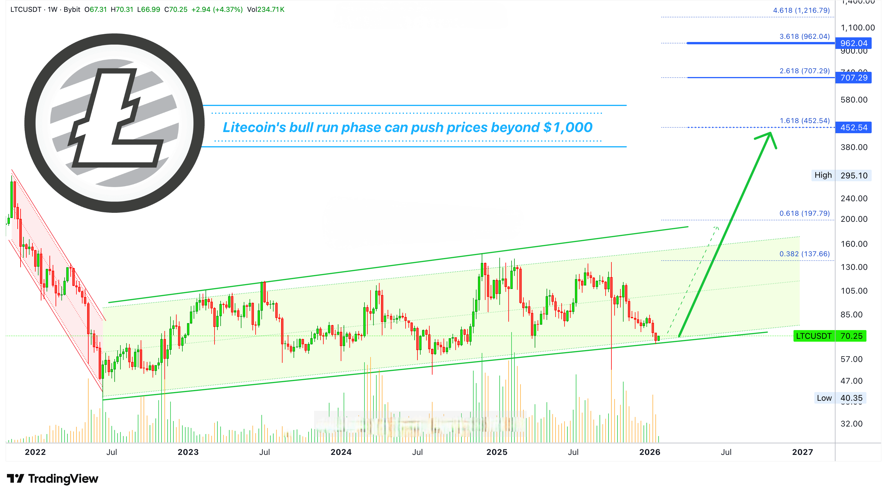 Parece que Litecoin es muy complejo en este momento, pero también es bueno, complejo y bueno. El movimiento ocurría dentro de un canal ascendente a largo plazo. El mínimo vino en el mercado bajista anterior en junio de 2022. No hay nuevos niveles bajos después de esta fecha.