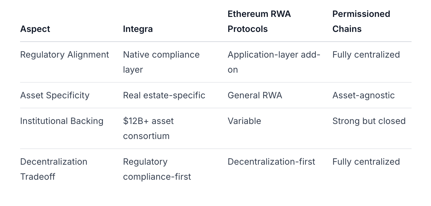 Posicionamiento: Integra se posiciona explícitamente como una capa de liquidación específica para bienes raíces en lugar de una plataforma RWA general. Este enfoque vertical es evidente en su estrategia de dApp nativa y en la composición del consorcio.