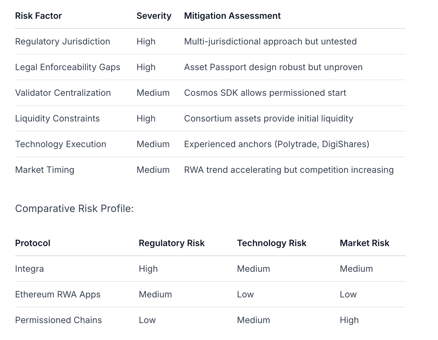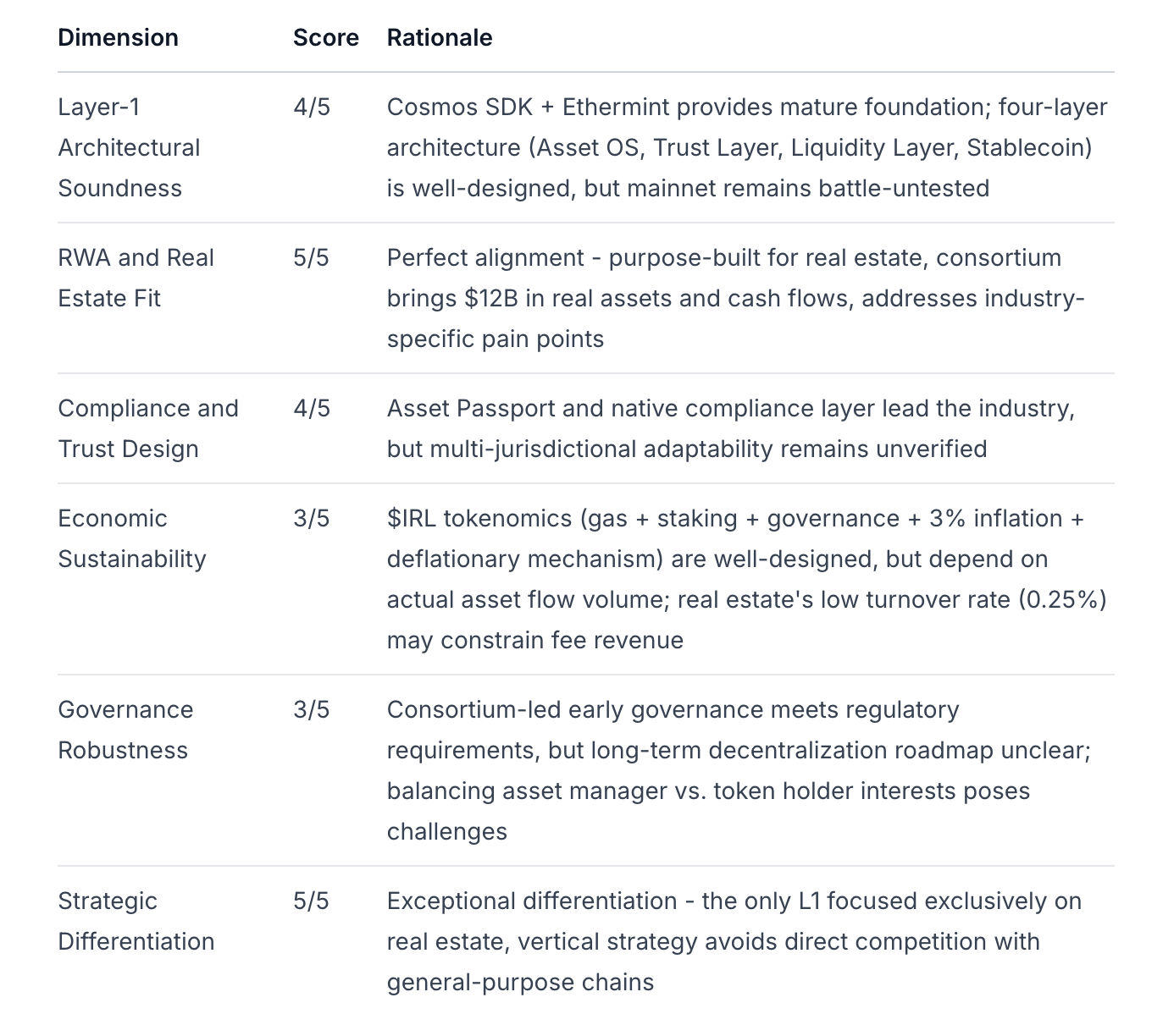 Tesis de inversión: Integra sobresale en diferenciación arquitectónica y posicionamiento en el mercado, con una convincente estrategia vertical de bienes raíces L1. El respaldo de activos reales de $12B+ y la integración de tecnología de Polytrade proporcionan ventajas significativas. Sin embargo, el riesgo de ejecución y la complejidad regulatoria no pueden ser ignorados: los bienes raíces son una de las clases de activos más reguladas a nivel mundial, y el puente legal en cadena/fuera de cadena sigue siendo un desafío no resuelto en la industria.